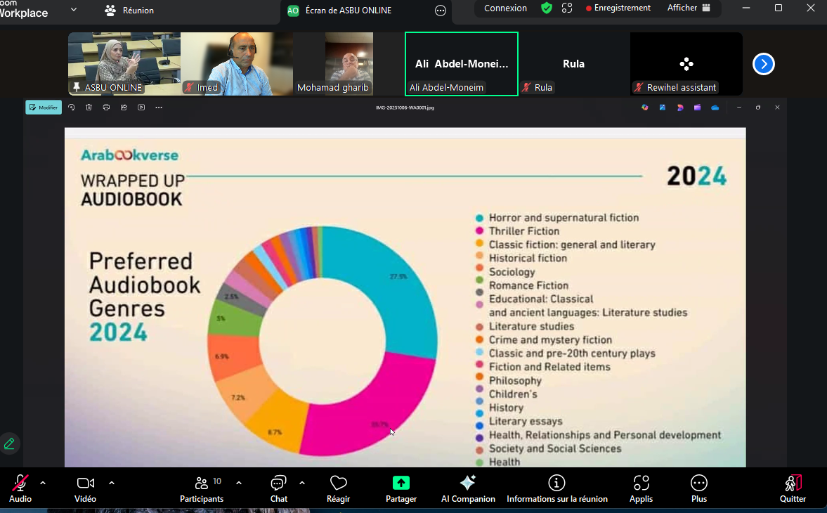 انتظم اليوم الاثنين 6/10/2025 بتقنية التواصل عن بعد الاجتماع الأول للجنة التأسيسية لمجموعة الكتب الصوتية في اتحاد إذاعات الدول العربية ASBU Audiobook Group، هذه البادرة التي اقترحتها الإدارة العامة للاتحاد وتمّت مناقشتها في الاجتماع الأخير للجنة الدائمة للإذاعة التي شكلت لجنة تأسيسية لصياغة مشروع إنشاء هذه المجموعة ليعرض لاحقا على المجلس التنفيذي والجمعية العامة للاتحاد .