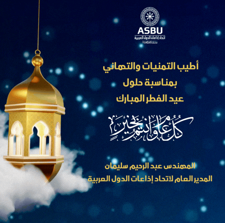 بمناسبة عيد الفطر المبارك، يسعد المدير العام لاتحاد إذاعات الدول العربية المهندس عبد الرحيم سليمان أن يتقدم بأحر التهاني إلى سعادة الأستاذ محمد بن فهد الحارثي رئيس الاتحاد رئيس المنتدى السعودي للإعلام، وإلى الأستاذين محمد عبد المحسن العواش النائب الأول لرئيس الاتحاد المستشار الاعلامي لوزير الإعلام الكويتي ومعالي عبد الكريم حمّادي النائب الثاني لرئيس الاتحاد رئيس شبكة الإعلام العراقي، كما يسعد المدير العام للاتحاد أن يهنئ بهذه المناسبة الكريمة كافة رؤساء الهيئات الأعضاء ومسؤوليها والعاملين بها وبالإدارة العامة للاتحاد